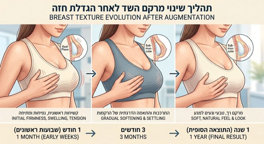 אחד הדברים החשובים להבין הוא שמרקם השד לאחר ניתוח הגדלת חזה משתנה לאורך זמן. הגוף עובר תהליך הסתגלות לשתלים, ולכן התחושה והמראה משתנים בהדרגה.